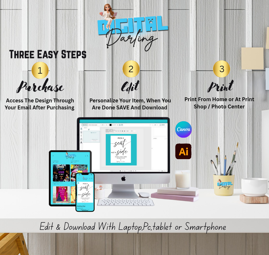Pick a seat not a side wedding sign, editable PDF template download